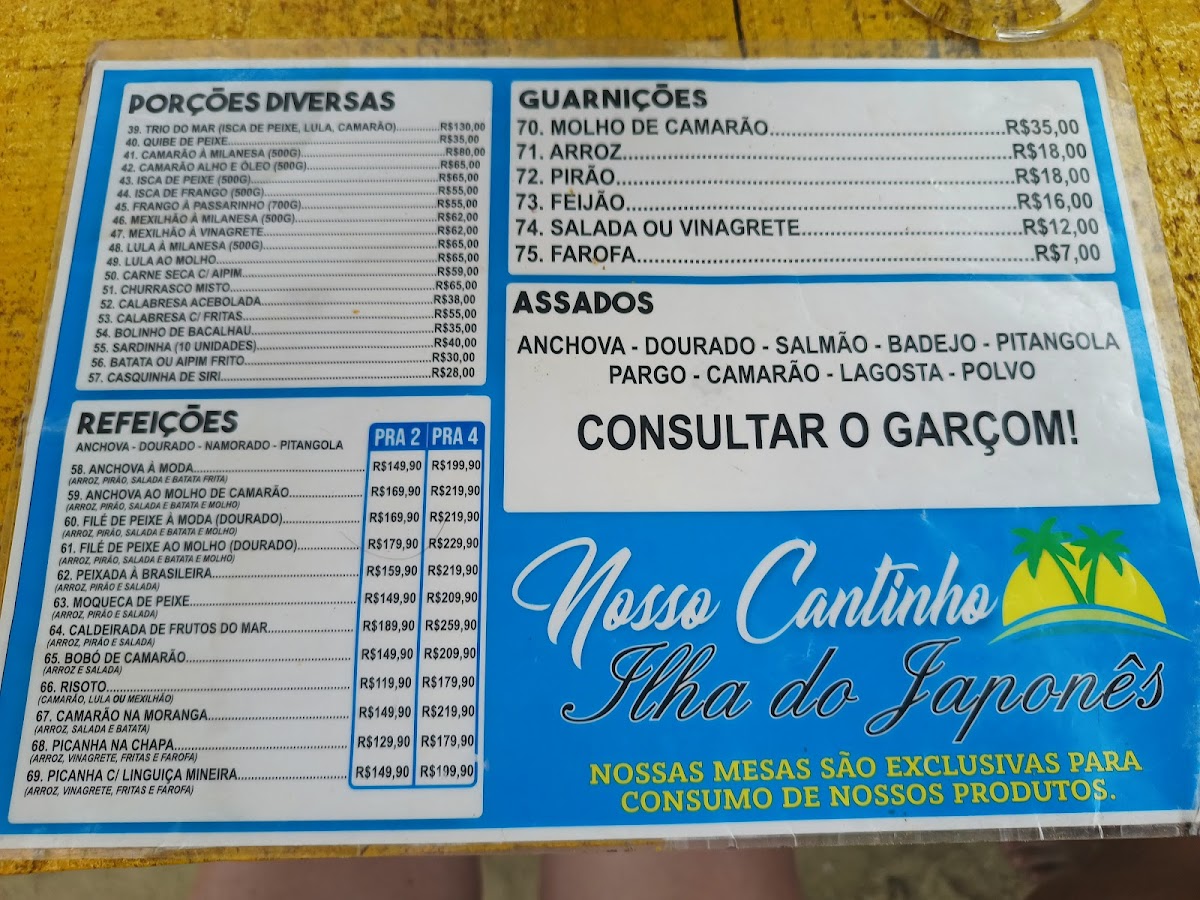 Welcome to Restaurante Nosso Cantinho, a hidden gem on Ilha do Japonês in Cabo Frio, RJ. This restaurant offers a delightful culinary experience with a menu that emphasizes fresh seafood and generous portions. Patrons rave about the attentive service, with many highlighting the friendly demeanor of the staff, such as the commendable service from Douglas.